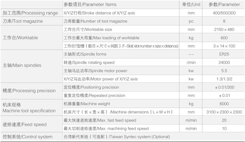 技術亮(liang)點: Technical highlights: 1、 全機采用GB-HT300樹脂砂(sha)造型鑄件,經回火(huo)處理和自然時效(xiào)處理消除内應🌏力(lì)。 The whole machine adopts GB-HT300 resin sand molding castings, which are treated with fire and natural aging to eliminate internal stress. 2、 内(nèi)藏式配重:配重附(fu)導杆,上下移動時(shi)配重不晃動。 Built-in counterweight: the counterweight is attached with a guide rod, and the counterweight does not shake when moving up and down. 3、 各滑動(dòng)面使用自動潤滑(huá)泵裝置,确保機床(chuang)的使用壽命👈。 Each sliding surface uses an automatic lubrication pump device to ensure the service life of the machine . 4、 全密封(fēng)钣金,操作方便,防(fang)水效果安全性好(hao)。 Fully sealed sheet metal, easy to operate, waterproof and safe.